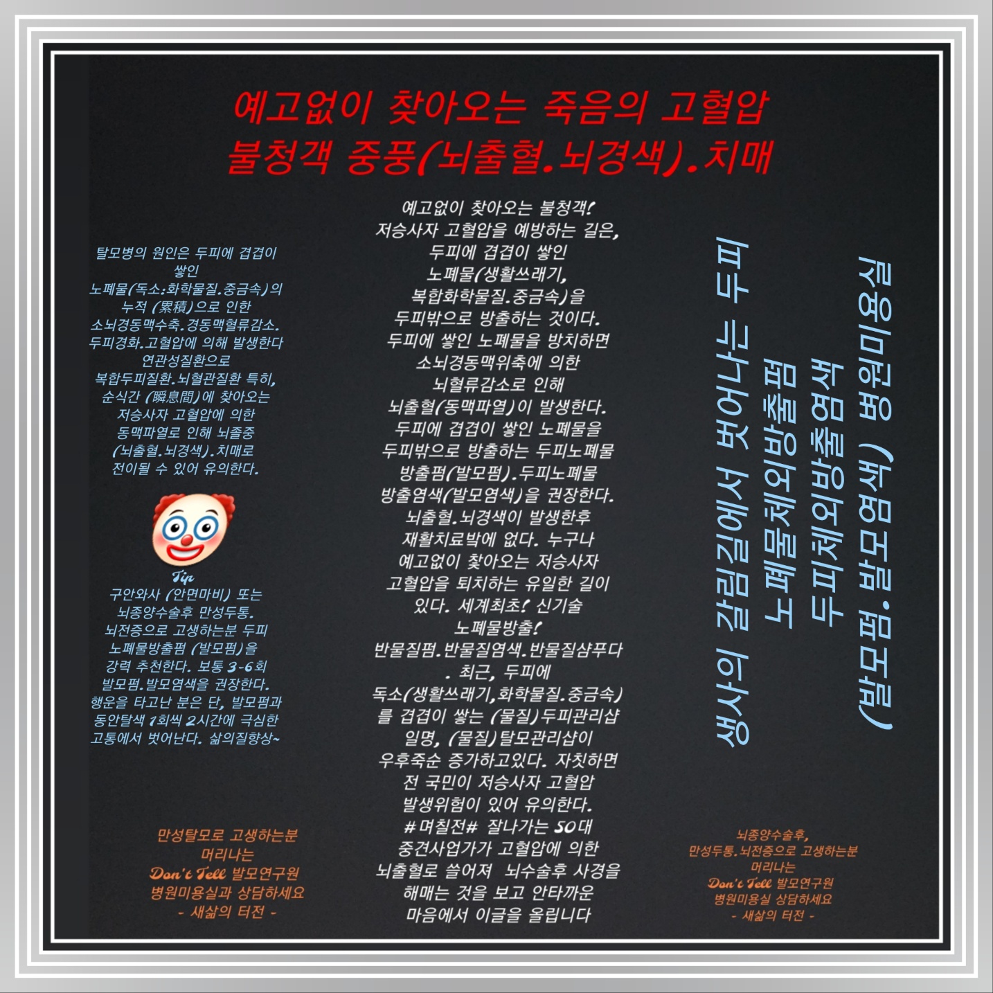 두피 누적 노폐물 (화학물질.중금속)을 방치 (放置)한다. >>>복합두피질환.복합뇌혈관질환,뇌기능저하.얼굴피부노화 등. 유발 (誘發)한다
